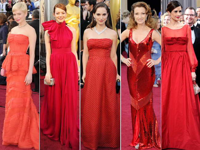 أشياء كثيره كانت دارجه مشكل ملفت على السجاده الحمرا .. منها اللون الأحمر شفناه على العديد من النجمات .. مثل ميشيل ويليامز وناتانلي بورتمان وغيرهم