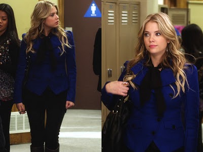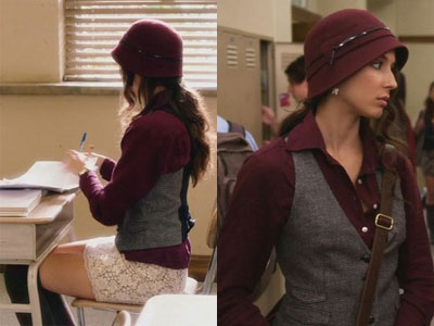 قميص وكرافيت مع جاكيت عنابي لبقتها على تنوره جينز وتسريحه شعر بضفاير مرفوعه