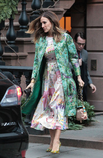 لو أحد قالي البسي فستان مطبّع مع جاكيت مطبّع أخضر وحذاء مطبّع بقول معليش كثييير .. بس طلّة سارة جيسيكا باركر طالع جميلة وجريئة .. شي غير متوقّع يعني ..