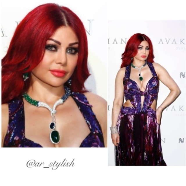 الفستان مو سيء والعقد يجنن بس الإثنين مع بعض وزيادة عليهم لون شعرها الأحمر وإسورة ألماس كمان طلع شكلها يعور العين بصراحة