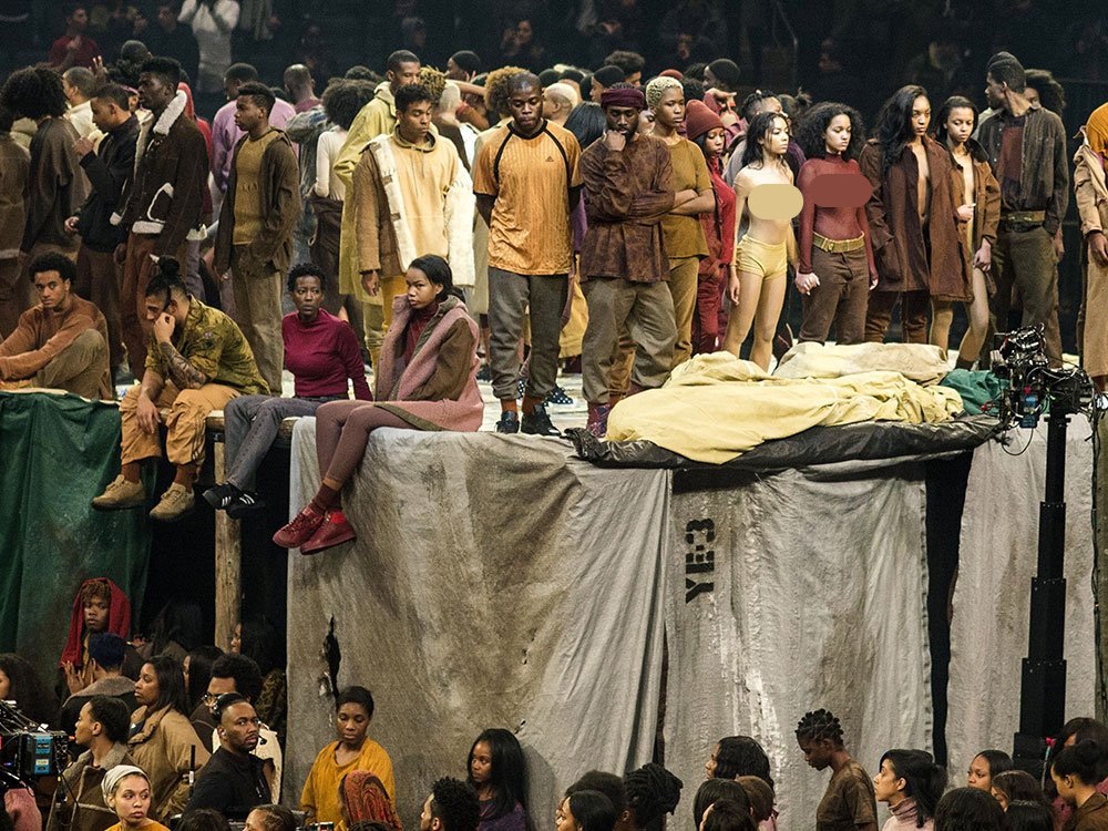 – العارضات والعارضين للمجموعة الجديدة كانو واقفين على منصتين منفصلتين وتحتهم أكثر من الف عارض وعارضة آخرين لابسين من المجموعتين السابقة لـ Yeezy