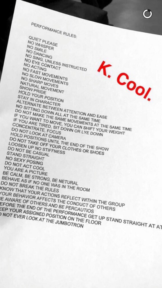 – العارضات والعارضين خضعوا لقوانين وتعليمات صارمة في هذا العرض من ضمنها لا ترقصون ولا تتواصلون بالعيون مع أي احد ولا تظهرون التوتر واوفقو ثابتين بدون حركات ملفته وغيره ،، شوفوا الصورة