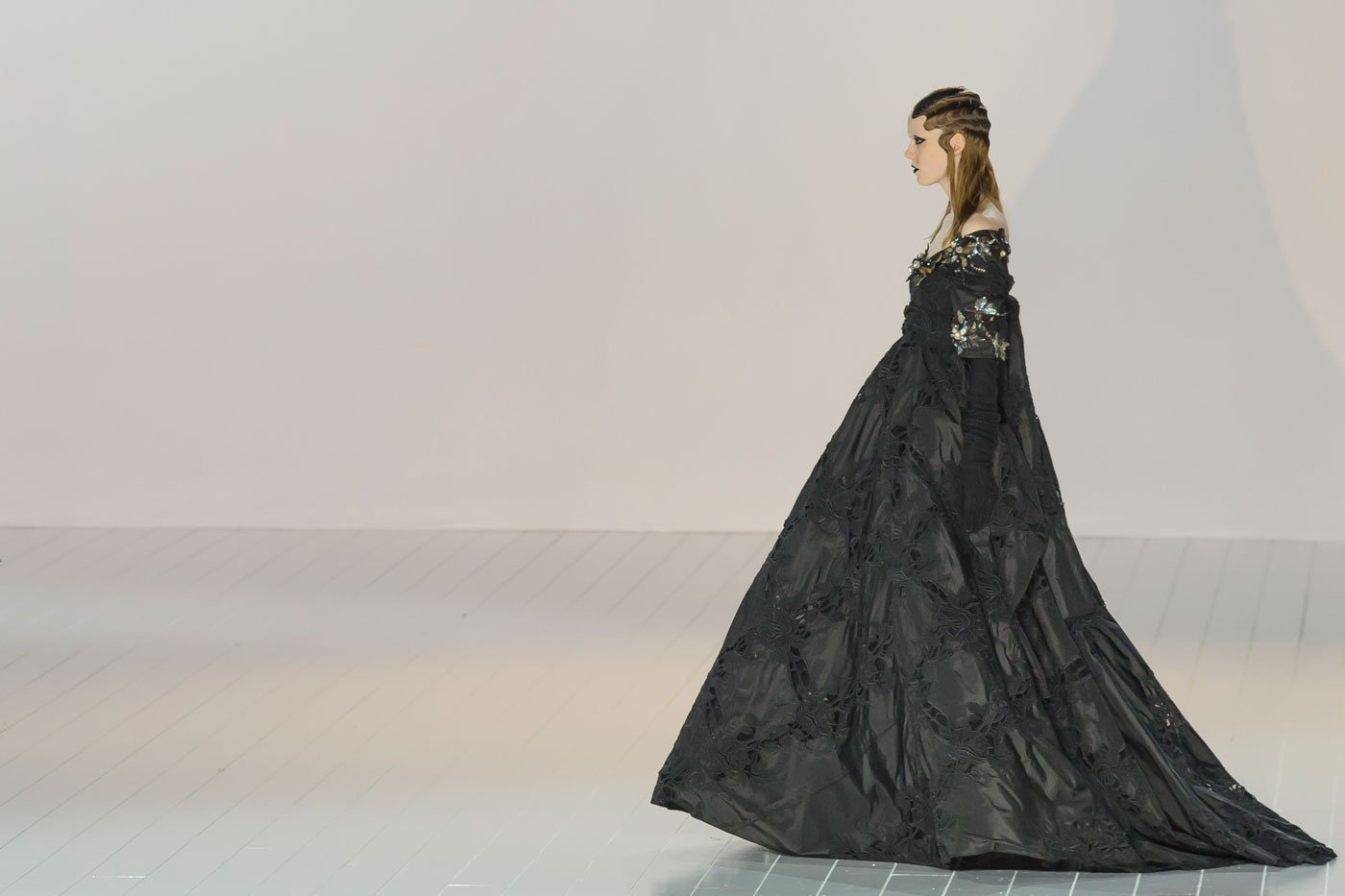 المصمم عرض مجموعته الكاملة بالأبيض و الأسود واستغنى عن حضور الألوان، بس بالمقابل ركّز على التصاميم الجميلة و القصات الهندسية وهذا برأيي اللي خلّا المجموعة مميزة. أنا بصراحة خقيت على التوب الأبيض.