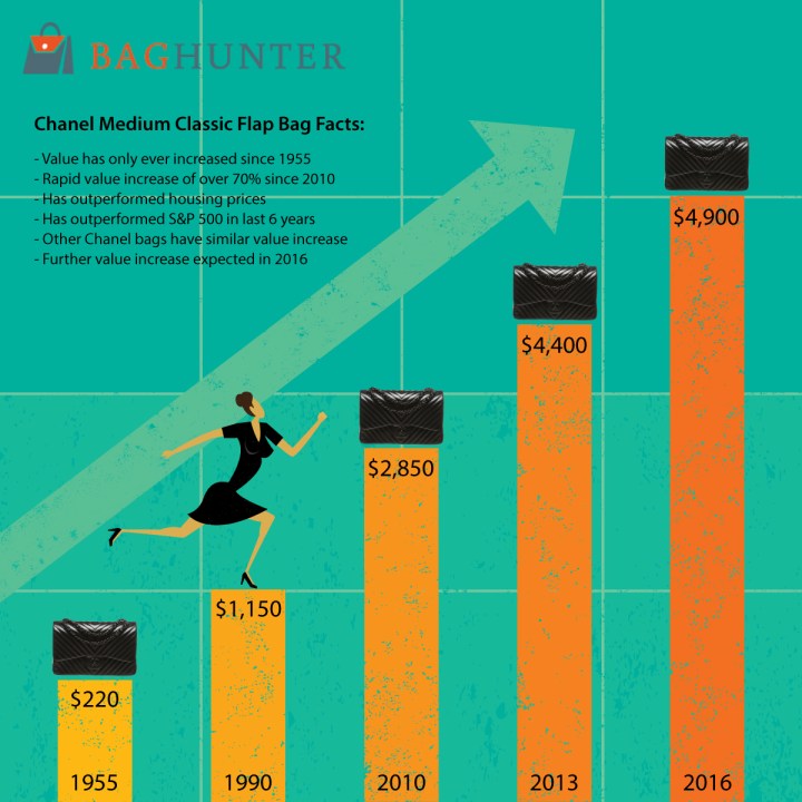 سعر الشنطة ارتفع حتى وصل هذا العام لـ 4900$ يعني أكثر من 18 الف ريال سعودي، وهذا الشي يخليها استثمار ذكي، سعرها ارتفع 70% من 2010 فقط وأكيد رح ترتفع أكثر في المستقبل، فإذا كنتي ناوية تشترين هذي الشنطة يوماً ما انصحك تقررين بسرعة وتشترينها فوراً لأن سعرها على الأغلب مارح ينزل، في الحقيقة رح يزيد سعرها أكثر هذي السنة تحديداً، ونفس الشي متوقّع من شنطة شانيل بوي Chanel boy اللي اطلقتها الدار في عام 2012 وصارت تنزل كل عام.